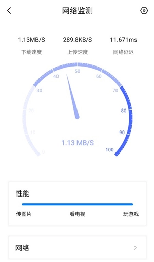点击屏幕中间的测速按钮即可,它会为你展示上传速度与网络延迟的具体数值,无论是传输图片、观看视频还是玩游戏,都能提供相应的性能评估。