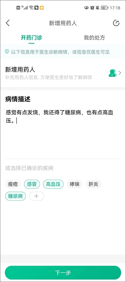 2、需要开药的话可以打开【复诊开药】功能,填写你的个人症状和疾病史以及个人信息等等,这样会有专业的医生为你开正确的药物。