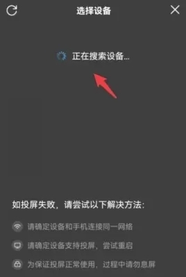 此时,应用会自动搜索附近可用的投屏设备。请在搜索结果中找到您的电视设备并选择它来完成连接操作。
