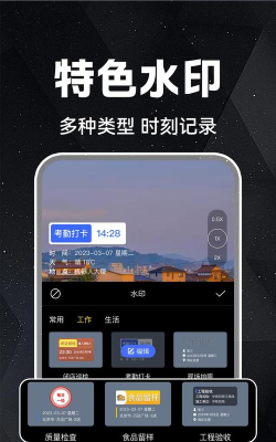 时间水印、地点水印、天气水印相机,支持批量图片操作,还有身份证等证件保护功能,文字水印可随意自定义;水印的大小、角度、位置、透明度都能一键调节,让微商、电商、淘宝从业者更省心!无论是打卡拍照、旅行拍照、工程管理拍照、外出考勤拍照、取证拍照还是工作记录拍照,都能帮您记录美好生活!