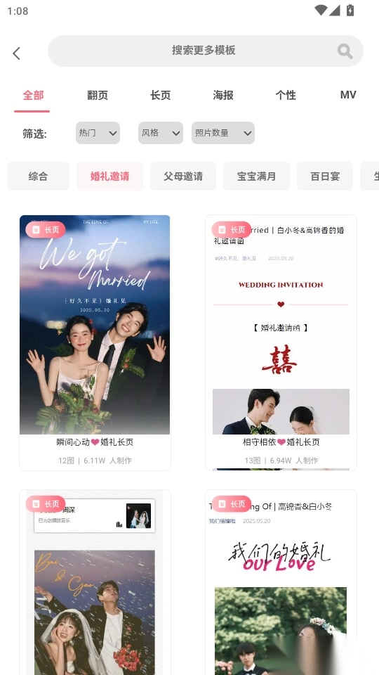 4. 从各式各样的婚礼请柬模板里挑选出你心仪的那一款,点击进入即可。
