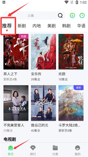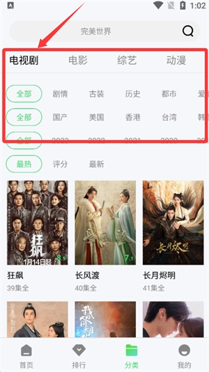 切换到分类页面,根据剧情、古装这类标签来筛选电视剧集。