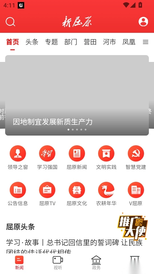 新屈原最新版这是一款拥有独特新闻报道和城市政务生活功能服务于一体的应用软件,在这里涵盖超多精选热点的新闻报道内容,轻松就可以掌握本地最新发布要闻消息,平台新闻分类栏目资源超级全面,各种大家感兴趣的新闻资讯通知一键获取;而且该软件还拥有不错的视听服务,各种直播新闻、短视频新闻、广播新闻、电台新闻等资源应有尽有;除此之外,在新屈原手机版软件当中还拥有许多热门的新闻视频专题,随时都可以在线高清的播放欣赏;喜欢这个软件的小伙伴们可以来本站直接体验哦!