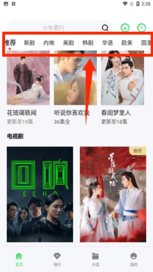 通过顶部推荐、新剧等分类标签切换不同版块资源。