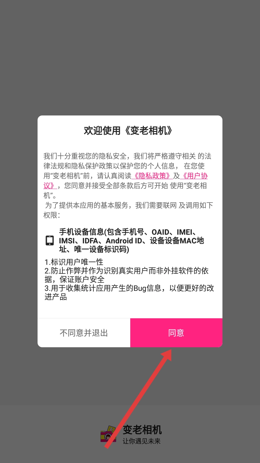 在《变老相机》的隐私政策弹窗里,点击【同意】按钮,即可进入主界面。