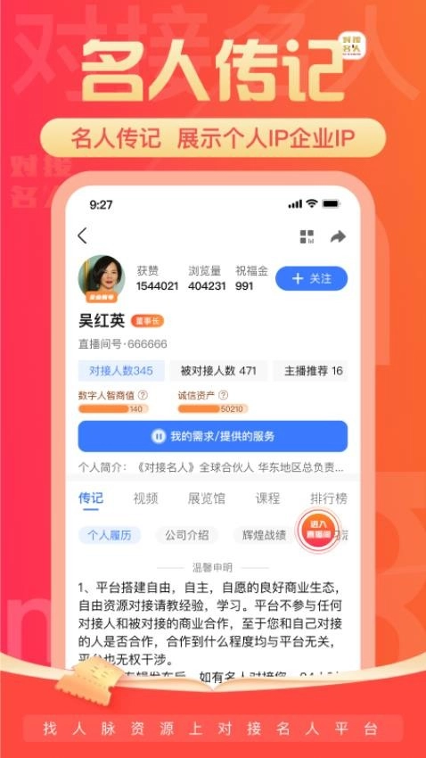 可以与名人开展业务资源的供需对接,让资源对接及商务合作更加便捷。