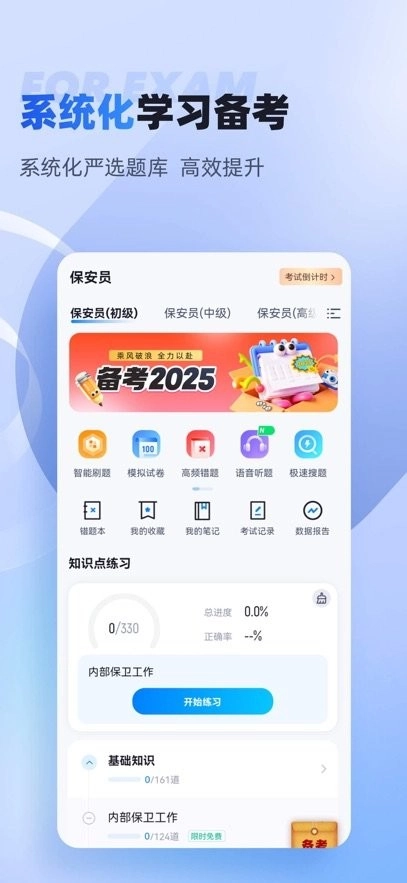 保安员题库内含考点练习,全国通用卷以及地区卷模拟练习,以及按照固定考试比重的随机式的抽题的真题考场,成绩单实时记录考试数据,一点一滴的反馈考生近期学习状态以及自我正确率的提升,大大的给予考生通过考试的信心。
