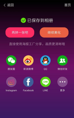 用海报工厂完成拼图后,还能一键分享至朋友圈、新浪、QQ空间、Instagram、Facebook、Twitter等社交平台,既有趣又便捷。
