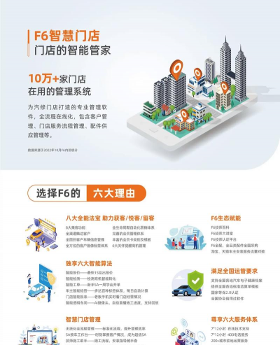F6智修是F6汽车科技打造的智慧维修管理系统,融合了维修厂流程管控、维修应用数据查询、车主营销、配件供应链对接等功能,实现PC端与移动端的全方位同步,帮助维修厂提升整体实力。