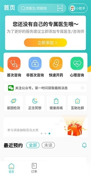 1、首先在本站安装并打开这款软件,完成注册登录后进入首页,首页展示心理咨询与快速开药服务,点击下方的基因检测、正念冥想、健康商城及互助社群按钮,会跳转至对应的小程序进行后续操作,页面下方还显示着最近预约的提醒;