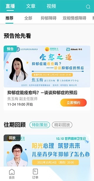 3、在名医课堂页面,能看到软件推荐的直播、文章、视频等内容,这些都由入驻医师发布,其中不乏全国各大知名医院的医师;我们既可以预约即将开始的直播,也能回放往期直播。