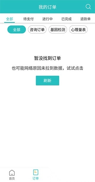 2、在订单页面,我们能够查看自己所有的订单信息,涵盖咨询订单、基因检测、心理量表以及药品订单等类别;页面上方设有待支付、进行中、已完成、退款单等分类标签,右上角还有搜索图标,这些功能都能帮助我们更便捷地快速查找所需订单。