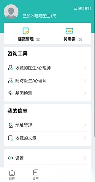 4、最后是“我的”页面,这个页面通常用于查看个人信息以及对软件进行相关设置。在这里,我们可以编辑自己的基本资料,还能进行档案管理、查看优惠券、浏览收藏的医生/心理师以及随访的医生/心理师,同时也可以管理收货地址。