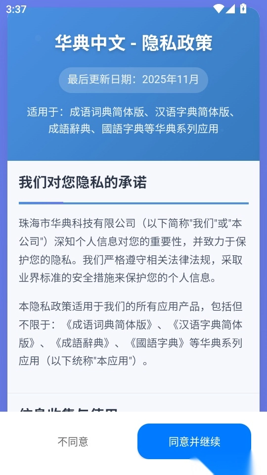 1. 首先打开软件,阅读“隐私政策”后,点击“同意并继续”按钮进入。