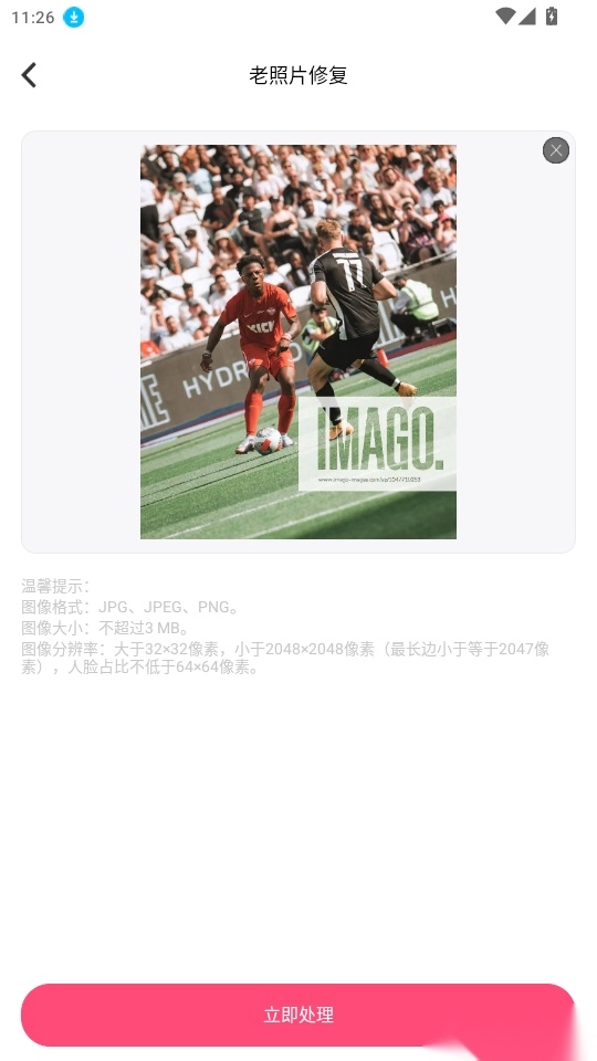 4. 随后点击“立即处理”按钮,就能对老照片开展高清修复工作。