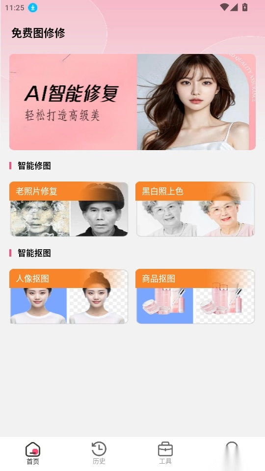 免费图修修是一款集成多种功能的AI智能修图工具,老照片修复、黑白照片上色、人像及商品抠图等实用功能——不仅能高清还原老旧照片原貌、延长其保存时间,还可快速为黑白照片添彩,让画面更鲜活;智能抠图工具则能帮助用户精准高效地完成抠图,确保边缘干净利落,带来无痕抠图的流畅体验。除此之外,软件还贴心配备了成语典故查询、多音字检索、金额转大写、BMI标准体重计算、BFR体脂率测算等日常辅助功能,满足用户多方面需求。有需要的朋友不妨来免费图修修体验一番!
