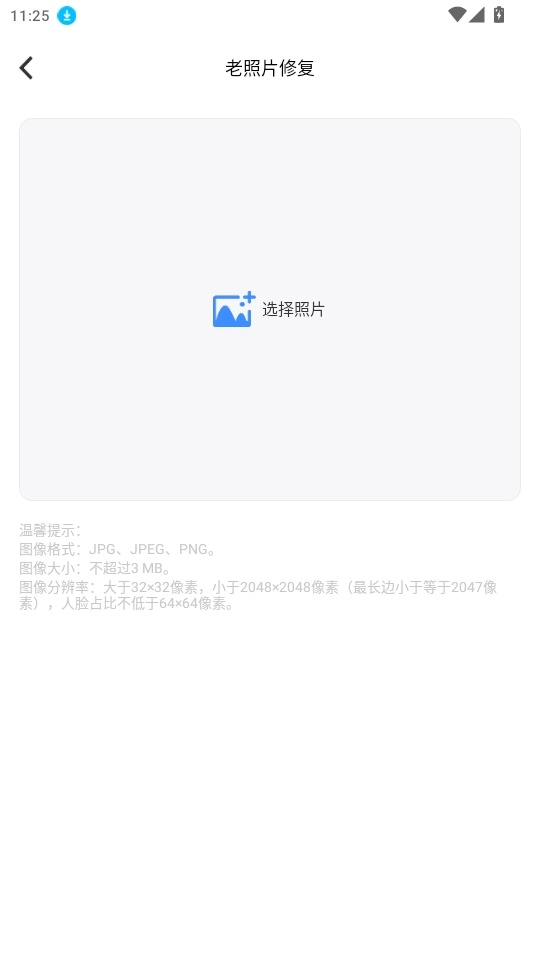 3.进入老照片修复页面后,点击“选择照片”,就能从本地相册里挑选照片导入。