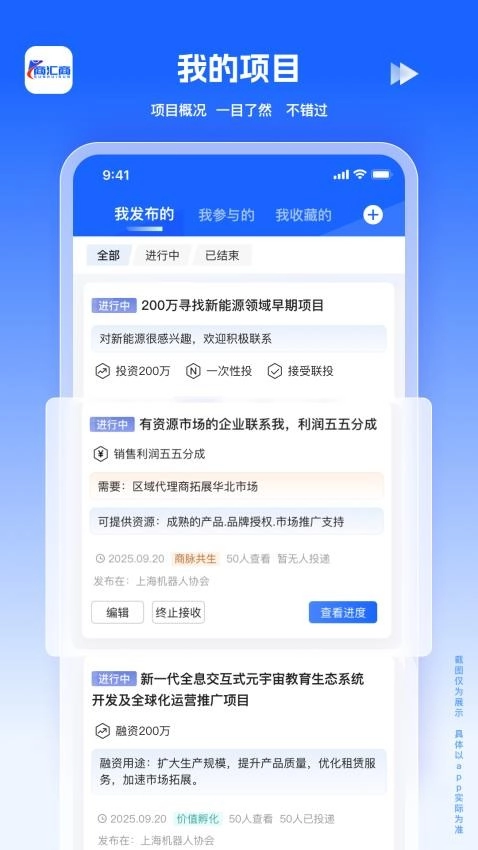 商汇商主要为用户提供线上企业商会合作服务,让用户能够实时挖掘更多商机,方便随时查看自己的商户信息,自由选择并加入心仪的商会,轻松获取商会相关资讯;此外,用户还可以对接项目合作,挑选感兴趣的合作对象开展实时合作,并能便捷地查看合作进度。