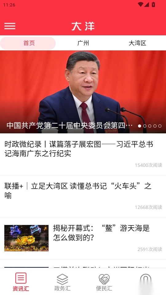 大洋是一款集合了资讯汇、政务汇、便民汇多种功能的软件,软件中将广州、大湾区的各种新闻资讯信息全面推送,用户可以随时查看各种新闻资讯内容,了解更多更精彩的新闻资讯信息,其中还推送有很多的党政资讯内容,便于用户随时关注国家大事,还可以随时观看政务直播,更直观的了解更多实时政务讯息,还有超多的便民服务,可以便利生活,为广大用户的生活带来更多的便利体验,可以随时在这里缴纳各种生活费用,同时在这里查天气、查快递、查实时公交都非常的方便,有需要的用户就快来大洋手机版使用吧!