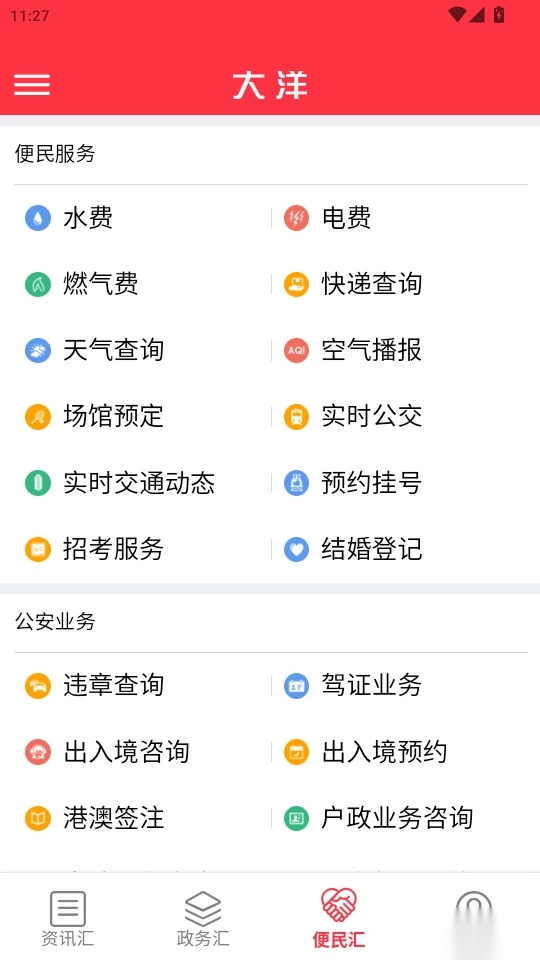 在便民汇功能中可以查找你需要的各种便民服务进行在线使用,畅享各种便民服务日常所需使用。