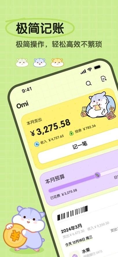 Omi 记账是一款高效便捷的智能记账软件,拥有多种快捷记账方式,助力你高效记账,更好的管理自己的财务。可爱的小仓鼠 Omi 将会作为你的首席财务管家,帮助你规划你的每一笔收支,让您清楚的了解每一笔钱都花在了哪儿,陪你一起养成记账好习惯~