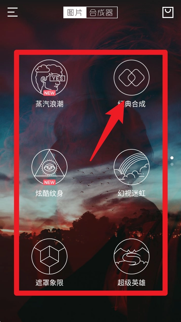 打开应用首页后,点击“经典合成”即可进入对应的功能模块;同时,你也可以浏览其他视觉风格分类,根据创作主题自由选择合适的合成方式。