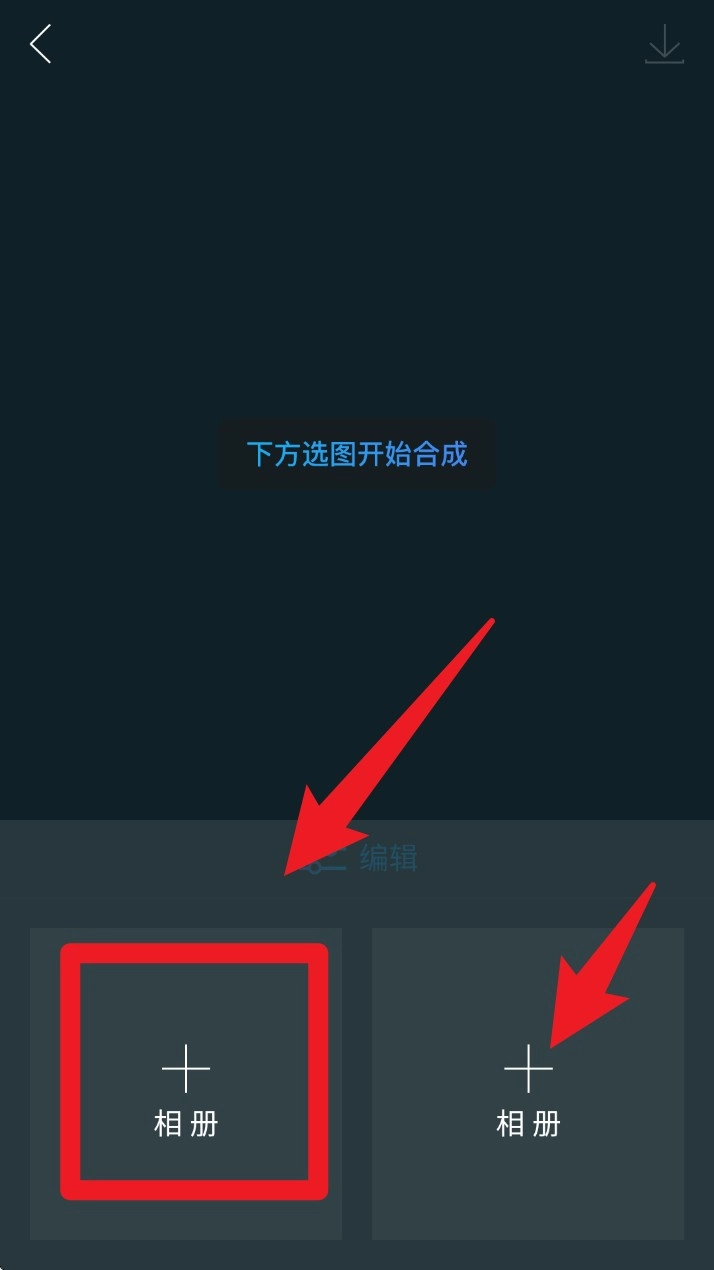进入合成界面后,点击底部的“相册”按钮导入图片,需要挑选两张素材图,分别用作背景和前景,系统会自动识别图层的位置。