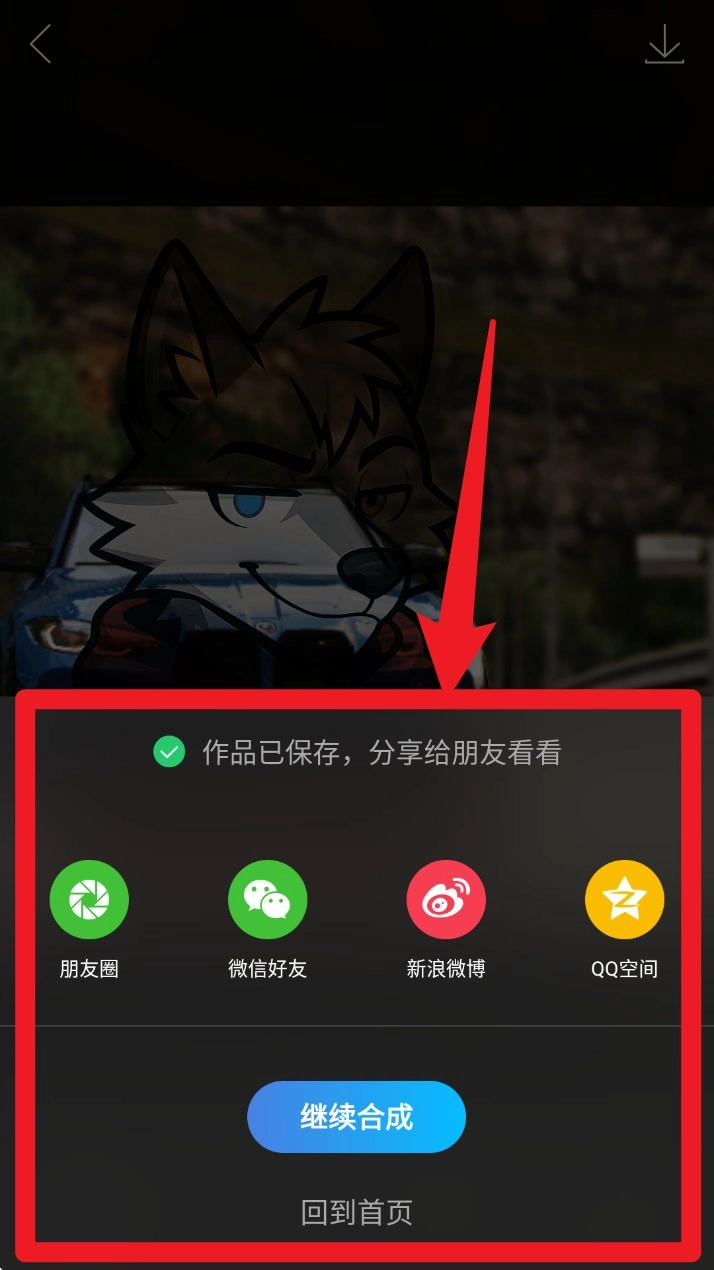 编辑完成后,点击右上角的保存按钮,页面随即会弹出“作品已保存”的提示。此时,你可以通过一键分享功能,将作品分享至好友、、朋友圈、QQ空间等各类社交平台。