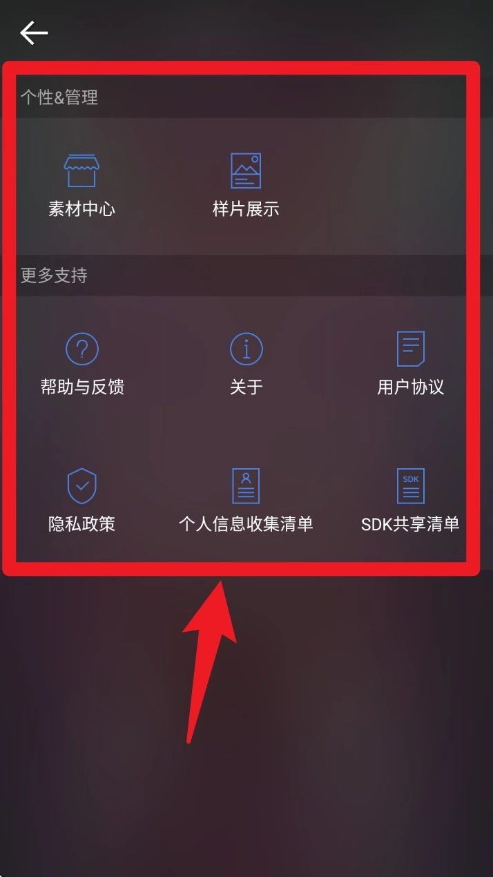 如果需要获取更多素材和创作灵感,可以点击左上角菜单,从中找到“素材中心”和“样片展示”板块;此外,用户协议、信息收集清单等相关支持内容也能在该菜单中查看。