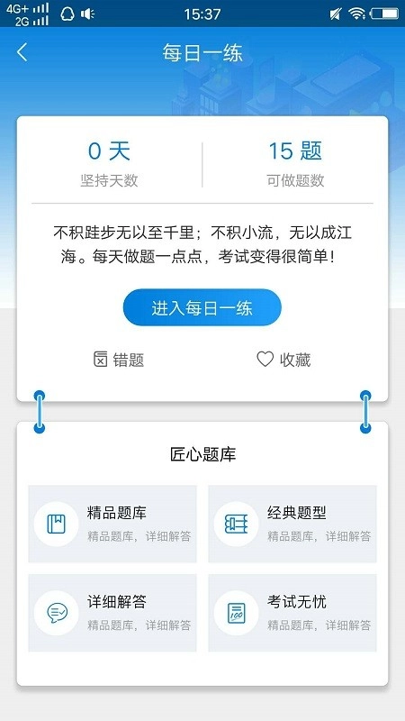 包含模拟考场、历年真题练习、每日一练、快速练习以及考点练习等功能模块。