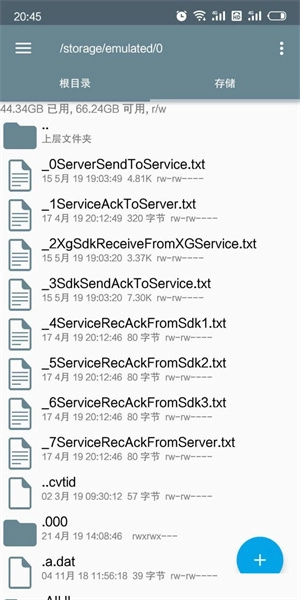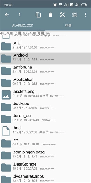 打开这款软件后,会呈现出如下界面。点击界面上方的文件路径,即可直接进行复制操作。路径下方显示的是手机剩余空间与已用空间的数据,旁边的r/w代表文件系统的权限设置。