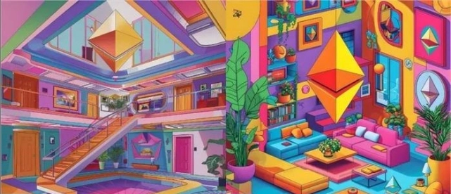 一个洋溢着活力与缤纷色彩的插画房间,容纳了形形色色的元素,每个元素都呈现出波普艺术风格的室内设计特色。该作品由迈克尔•克雷格-马丁创作。一枚三维的以太坊标志悬浮于房间的正中央。