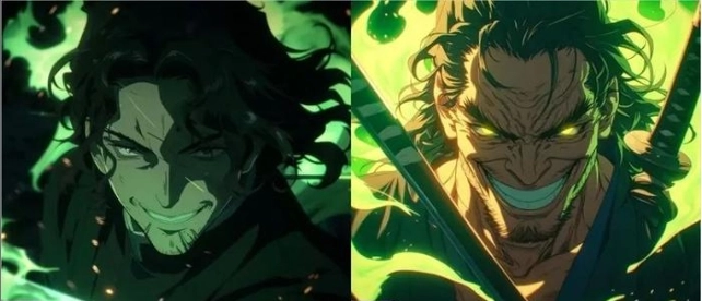 动漫场景中,面露狞笑的恶人特写镜头,手持寒光闪闪的武士刀,伫立在黑暗里幽绿燃烧的火焰前,边缘光线勾勒轮廓,发丝随风飘动,整体呈现攻壳机动队式的风格,背景色调深沉,画面具有电影级的强烈对比。