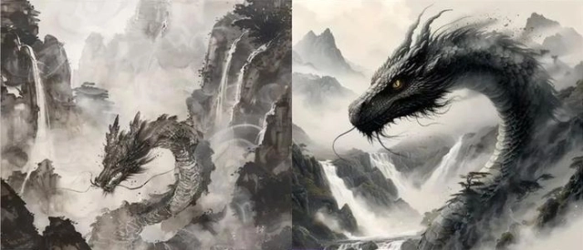 一位睿智的龙族老者自水墨山水间缓缓浮现。它蜿蜒的身形游弋在云雾氤氲的峰峦与飞瀑之间,鳞片与长髯皆以灵动笔触勾勒,于浓墨与浅淡的灰度渐变中自然过渡。那双金色眼眸穿透了整片单色画面,低角度的拍摄更凸显出它的威严气势。作品巧妙融合传统水墨画技法与当代数字艺术,达成了细节与抽象的精妙平衡,流畅的线条则为画面注入了十足的动感与生命力。