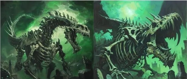 墓地之中,一条庞大的史诗骨龙正发出震耳的咆哮。它既有着壮丽无匹的身姿与全能的力量,又裹挟着深沉的黑暗与邪恶气息。幽绿的诡异光芒笼罩了整个场景。这是一幅原画。