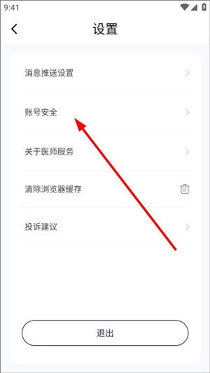 进入设置界面后,能看到消息推送设置、账号安全、关于软件、投诉建议等选项,接着点击账号安全这一项。