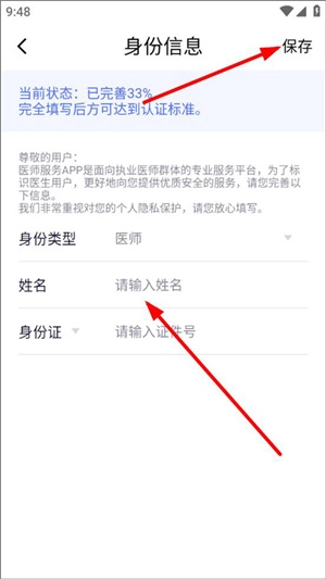 要进入身份信息页面,用户需依次填写身份类型、姓名及身份证件号,所有信息填写完毕后,点击页面右上角的保存按钮即可。