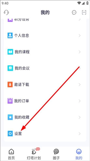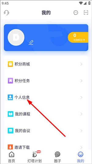 在我的页面里设有积分商城/任务、个人信息、我的课程、我的会议等功能选项,点击个人信息这一项;