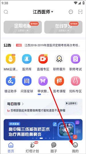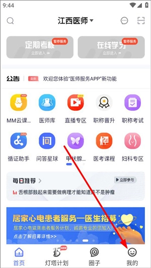 打开医师服务应用,进入其首页界面。首页上展示着定期考核、在线学习、公告、热点推荐等功能板块,随后点击“我的”选项。