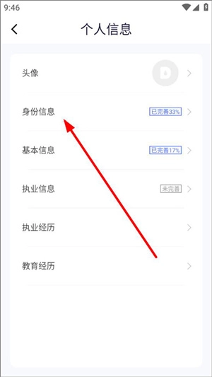进入个人信息页面后,用户能够对头像进行修改,还可以完善身份信息、基本信息、执业信息以及执业经历等内容,之后点击身份信息即可。