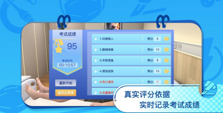 3:3D虚拟环境:借助高精度3D虚拟考生模型动画,对真实考生的操作规范与医疗器具使用方法进行模拟,同时还原考试现场环境,并采用现场考生的声音录制素材。