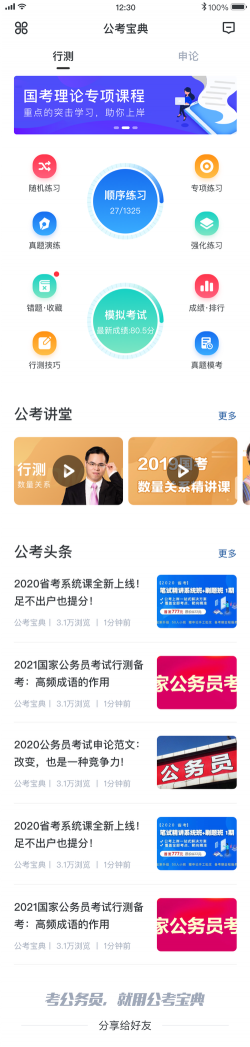 公考宝典是一款国内领先的免费为用户提供国家公务员、省级公务员、地方公务员考试,刷题和训练的公务员备考.全面覆盖多个考试类型,未来还会继续覆盖:公职培训,事业单位、教师招聘、教师资格证、考研、招警、公遴选、法院、检察院、银行、军队文职、军转、选调生、村官、政法干警、三支一扶、乡镇公务员、党政公选、国家电网、医疗等热门考试及选拔。