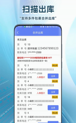 7.快递出库:可通过运单号、手机号或货号完成出库操作;支持同一收件人多件包裹合并出库