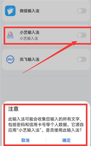 3、无需理会,直接点击确定”。接着在下图中,选择小艺输入法”,将其设置为默认输入法(其实也能在手机设置的系统和更新”里的语言和输入法”中,把它设为默认)。