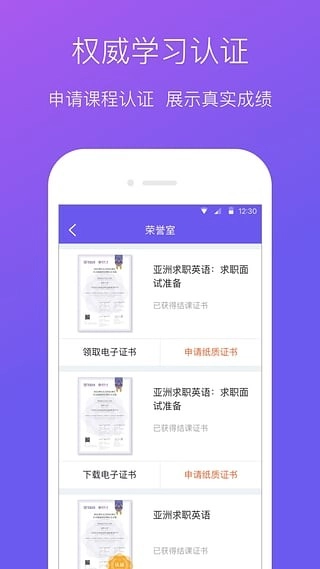 证书展示模块——荣誉室:学习者通过考试并达到标准后获得的结课证书可在此处查看,让MOOC证书“随身带”变得轻松便捷!