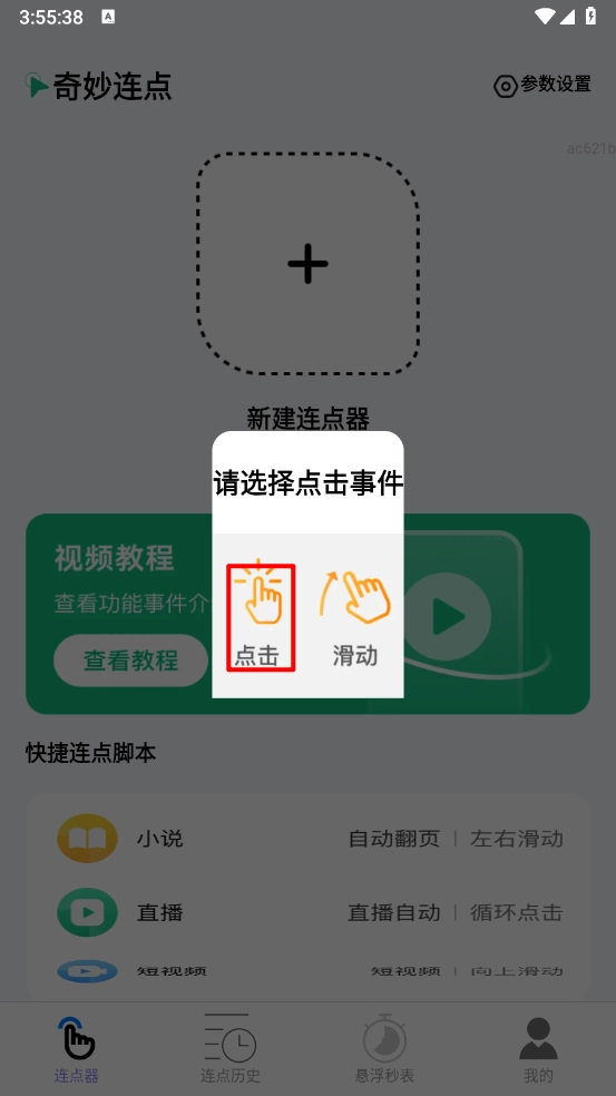7、接着在主页上点击“+”号来新建一个连点器,之后选择“单击”选项。