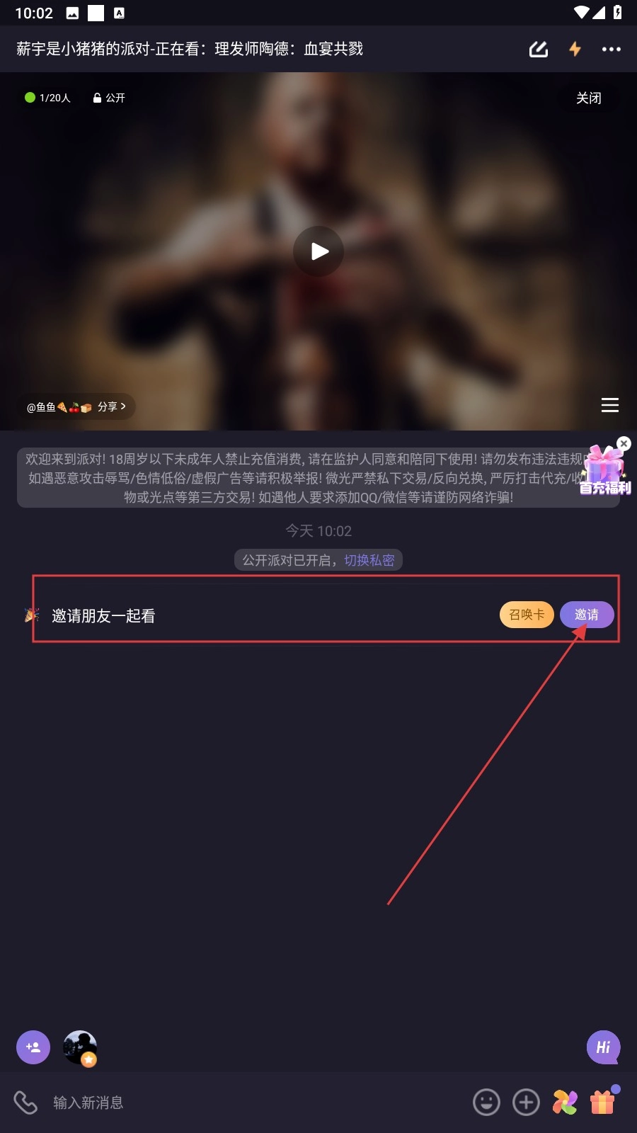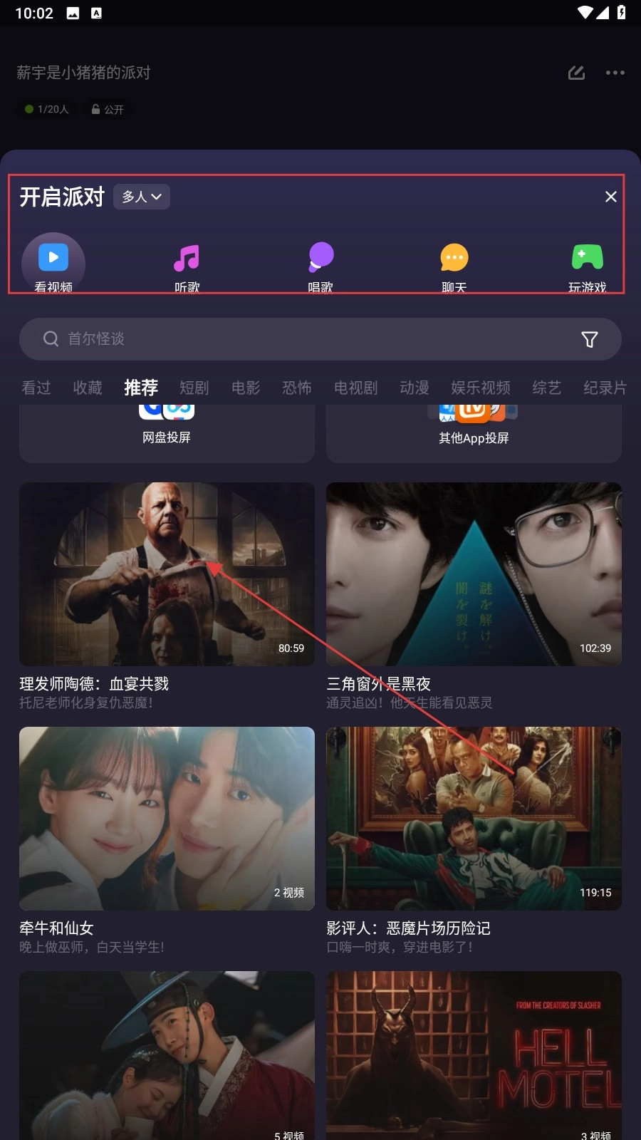 2、在房间里挑选派对类型,比如看视频,点击影片封面就能进入播放界面。