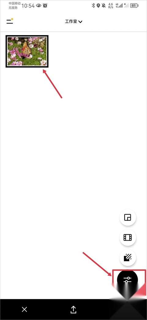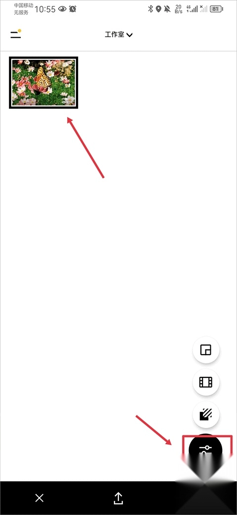 1、在中的工作室界面,先点击右下角的加号按钮导入一张照片