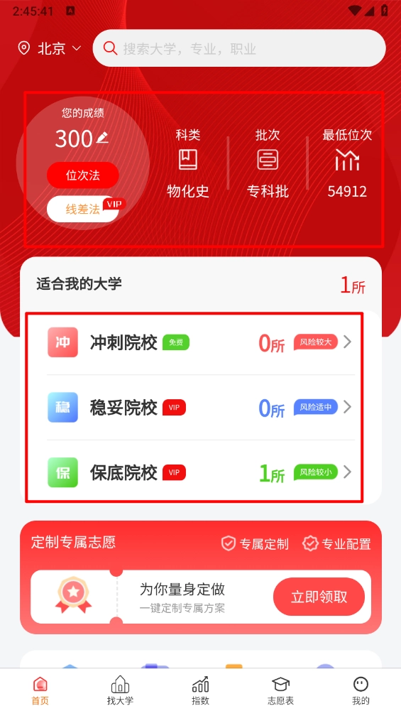 3、借助近年的大数据进行智能院校分析和匹配,为考生推荐冲刺、稳定和保底院校,助力考生精准定位目标院校。