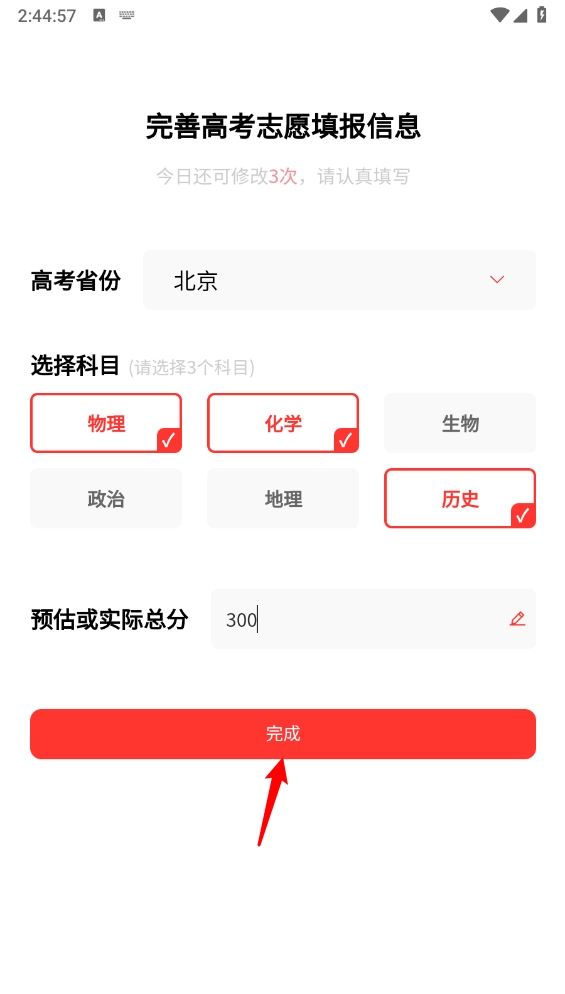 2、选择高考的省份、学科并输入预估分数点击"完成"。